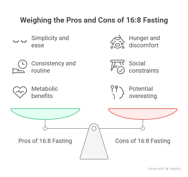 – **16:8 Fasting**: Extended fasting periods can lead to hunger, and there’s a risk of overeating during the eating window, potentially negating the benefits.