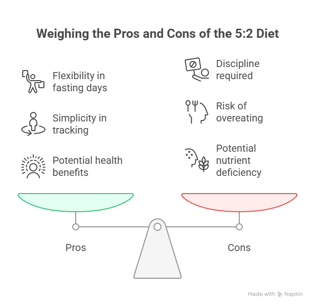 – **5:2 Diet**: Requires discipline on fasting days, and there’s a possibility of overeating on non-fasting days, which can offset the calorie deficit.