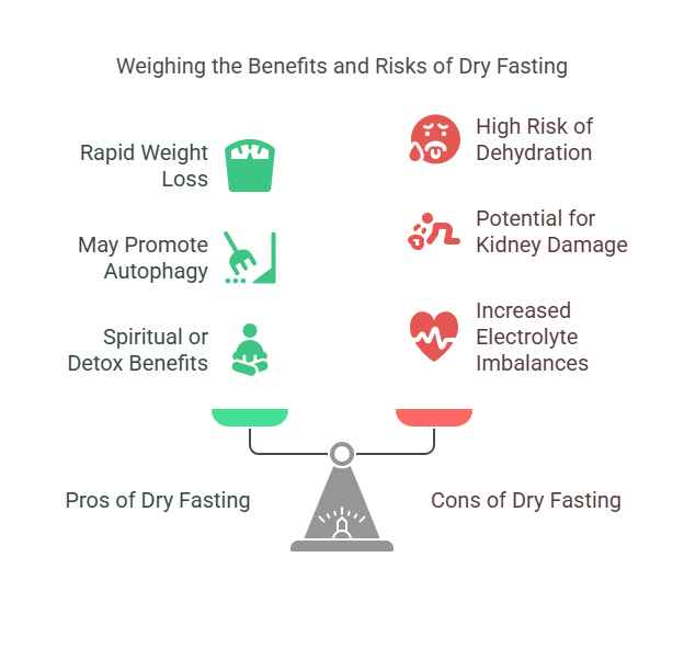 Dry Fasting poses significant health risks, primarily due to dehydration. Potential complications include kidney issues, fatigue, irritability, headaches, decreased urination, and constipation. Prolonged Dry Fasting can also lead to more severe health problems, such as organ damage. ([health.clevelandclinic.org](https://health.clevelandclinic.org/dry-fasting?utm_source=openai))