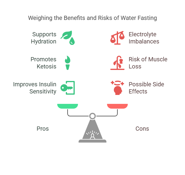 – **Water Fasting**: Risks include electrolyte imbalance and muscle loss, but generally safer.