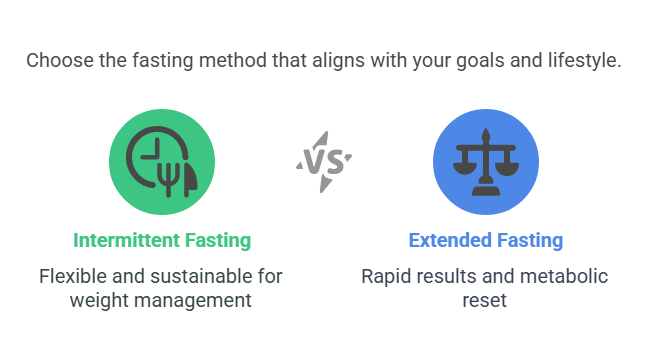 Choosing between Intermittent Fasting and Extended Fasting depends on your individual health goals, lifestyle, and ability to commit to a fasting regimen.