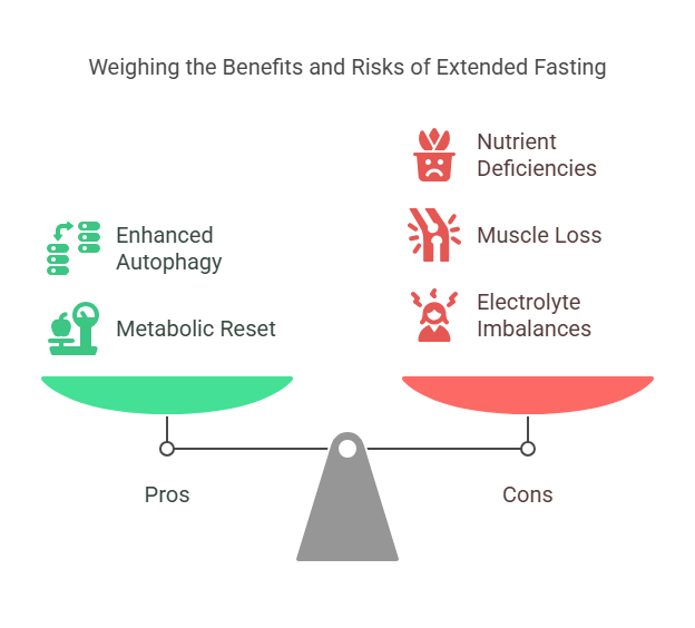 – **Extended Fasting**: Higher risks including nutrient deficiencies, muscle loss, electrolyte imbalances, and refeeding syndrome.