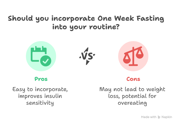 One Week Fasting involves fasting for one day each week, typically abstaining from food for 24 hours. This method is often chosen by individuals seeking short-term health benefits, those with busy schedules, or beginners exploring fasting.