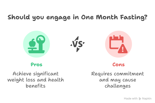 One Month Fasting entails fasting multiple times over a month, often involving longer fasting periods. This approach is typically pursued by individuals aiming for significant weight loss, those with experience in fasting, or those seeking long-term health improvements.