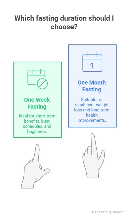 Your choice between One Week Fasting and One Month Fasting Results should align with your health goals, lifestyle, and experience with fasting.