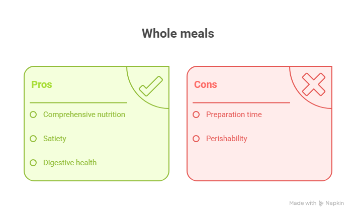 – **Whole Meals**: Require time for cooking and preparation, which might not be feasible for everyone, especially those with busy schedules.